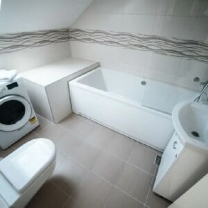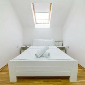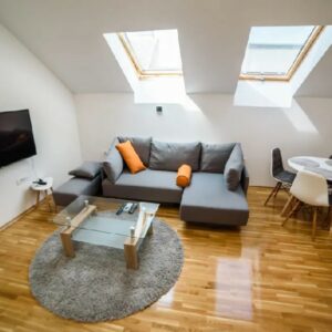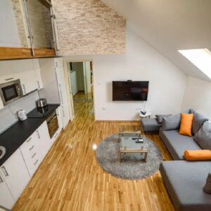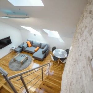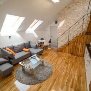 DANUBE PARK 3 je apartman u formi dupleksa, veličine 55m2. Nalazi se u potkrovlju, ali to nikako ne umanjuje njegovu lepotu. Ovaj apartman se sastoji od nekoliko zasebnih prostorija. Najveći deo donjeg nivoa čini velika dnevna soba, koja može da posluži i kao trpezarija, a u okviru nje se nalazi i dobro opremljena kuhinja. Ova soba je u sivo-belim tonovima što je čini prijatnom za oko na dnevnom osvetljenju koje dolazi sa krovno postavljenih prozora.