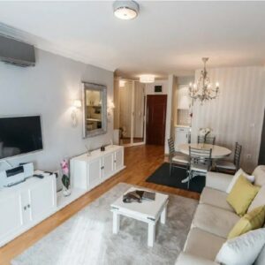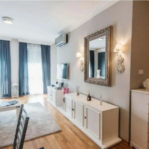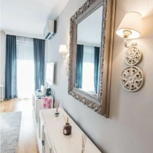 Dnevna soba je svetla i prostrana sa trpezarijskim delom pored i brižno odabranim stilskim ogledalom, lusterom i drugim očaravajućim detaljima. U odvojenom prostoru nalazi se jednostavna i praktična kuhinja sa belim elementima. Tu ćete pronaći sve što Vam je potrebno za pripremanje obroka, ukoliko to poželite.